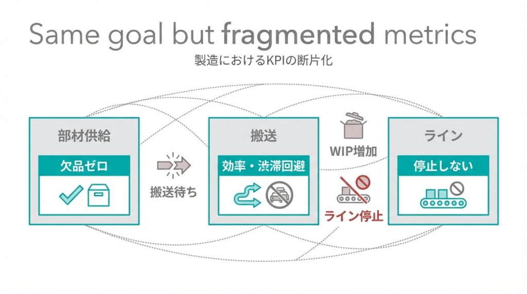 供給は欠品を出さない、搬送は渋滞させない、ラインは止めない――目的は同じでもKPIが分断されていると、個別最適が起こります。たとえば搬送効率を優先して待機を増やせば、ラインは部材待ちで停止します。