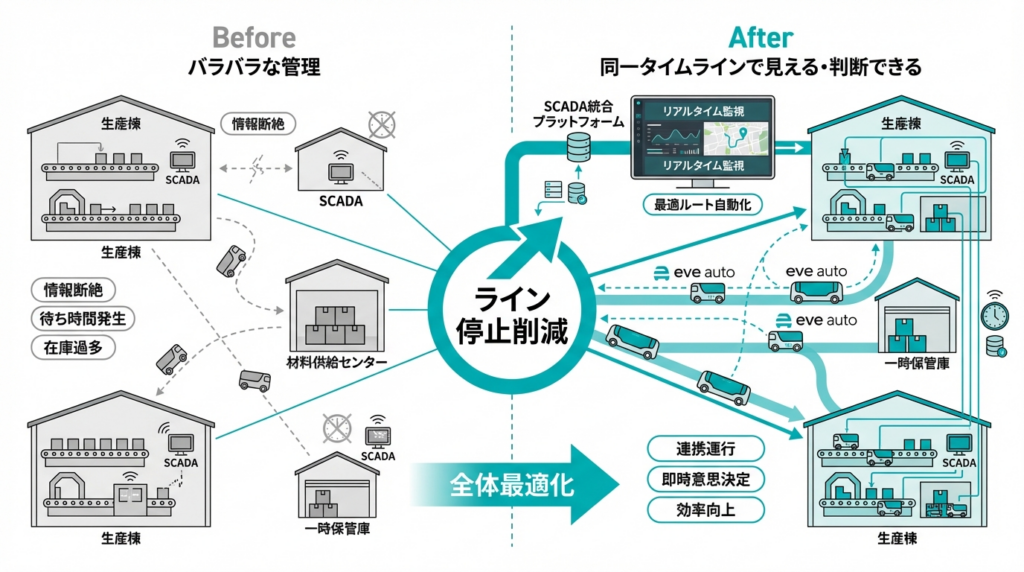 eve autoは、SCADAと連携することで、供給・搬送を「ライン停止削減」という目的で機能させます。搬送と供給を停止削減の視点でつなぐことで、建屋内外の動きを一つの流れとして捉えられるようになります。