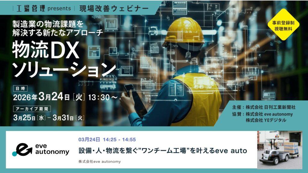 株式会社eve autonomy(イヴ・オートノミー、本社:静岡県磐田市、代表取締役CEO:星野亮介、以下「eve autonomy」)は、2026年3月24日(火)にオンライン開催される「【工場管理】現場改善ウェビナー『製造業の物流課題を解決する新たなアプローチ~物流DXソリューション~』」(主催:日刊工業新聞社)において、当社 セールス&マーケティング部 部長 龍 健太郎が登壇することをお知らせいたします。なお、本セミナーは3月25日(水)から3月31日(火)までアーカイブ配信も予定されています。